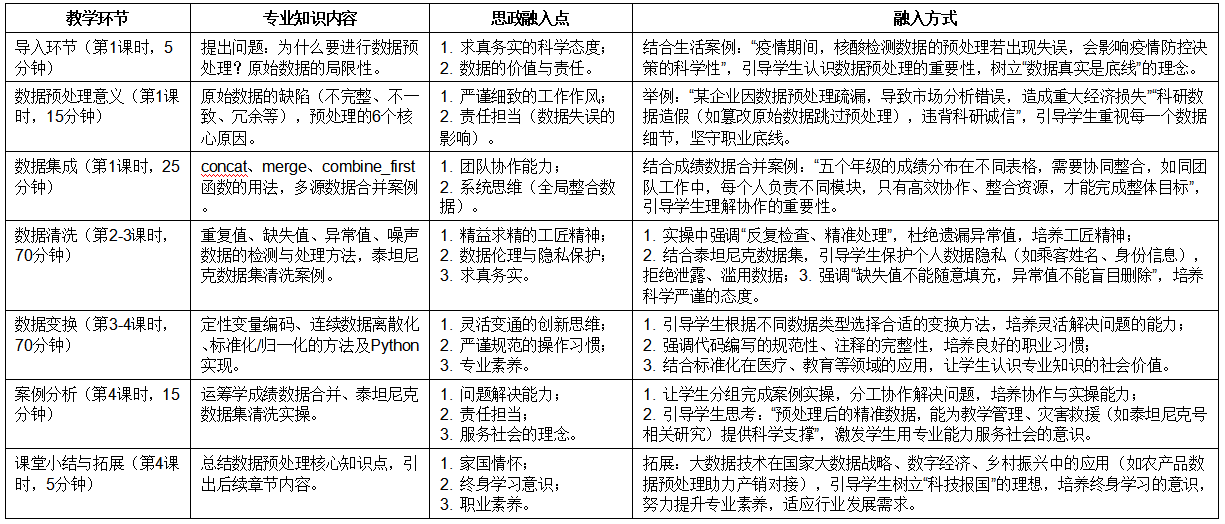 1.培养严谨细致、求真务实的科学态度:通过数据清洗中缺失值、异常值、重复值的处理,引导学生认识数据真实性的重要性,树立“数据无小事,严谨守底线”的职业理念。 2.强化责任担当与数据伦理:结合泰坦尼克数据集、成绩数据集的处理,引导学生重视数据隐私保护、数据诚信,拒绝篡改数据、伪造结果,树立正确的数据价值观。 3.激发精益求精的工匠精神:通过复杂数据合并、精准数据变换的实操训练,培养学生耐心钻研、反复打磨的实操素养,杜绝“差不多”思维。 4.培育团队协作与问题解决能力:结合案例分析(多表成绩合并),引导学生分工协作、互帮互助,培养主动思考、协同解决实际问题的能力,契合大数据行业岗位需求。 5.厚植科技报国、服务社会的家国情怀:结合大数据技术在各行各业的应用(如医疗数据预处理助力慢性病研究、教育数据预处理优化教学管理),引导学生认识专业价值,立志用大数据技术服务国家发展、改善民生。 能力培养目标